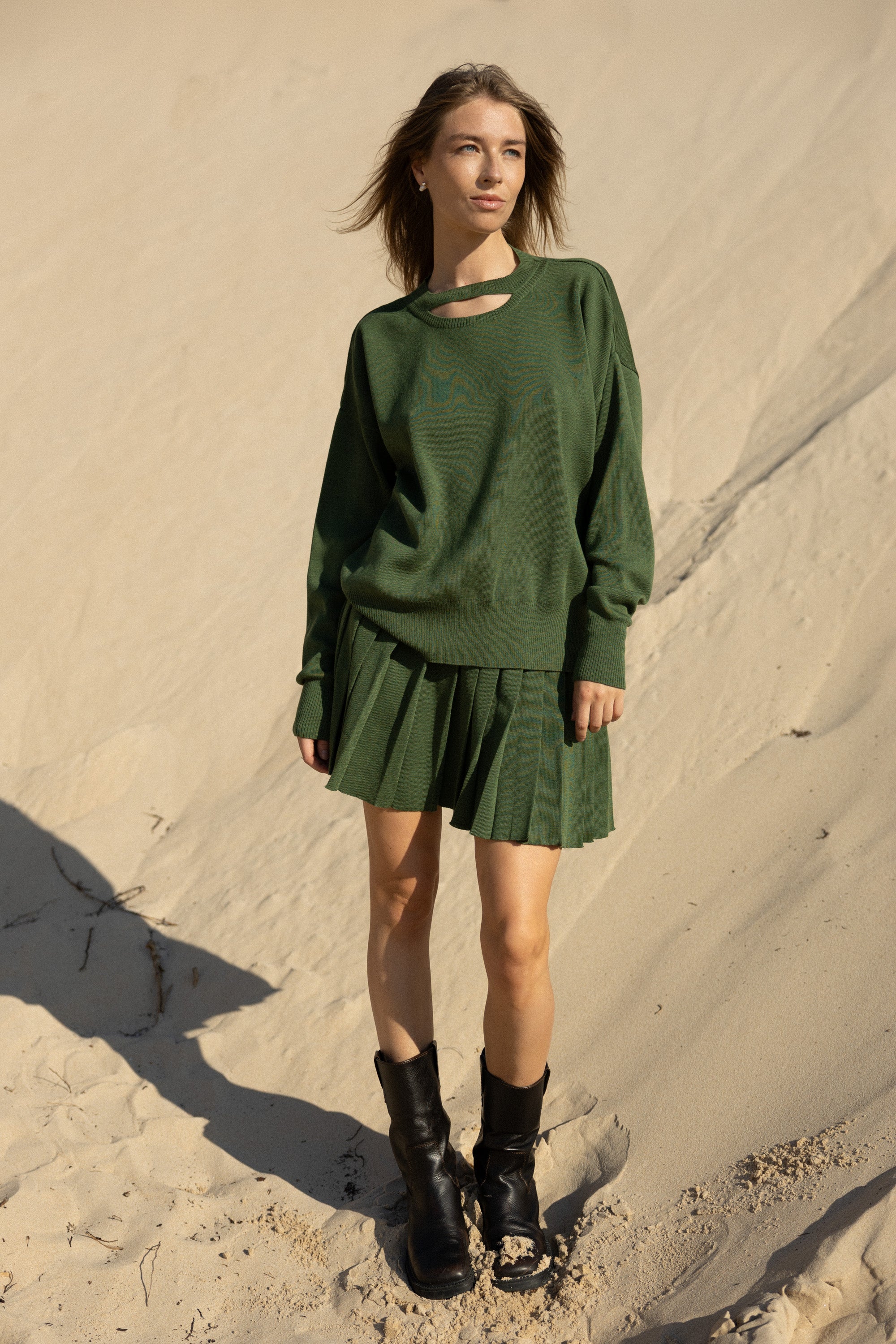 Rotondo džemper on One Size ja tal on oversized lõige keeruka kaelaväljalõikega, mis paljastab pisut ihu. Piccolo plisseeritud seelik istub vöökohal reguleeritava kummipaelaga, mis tagab isikupärase sobivuse.